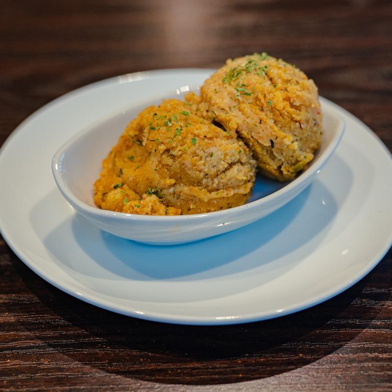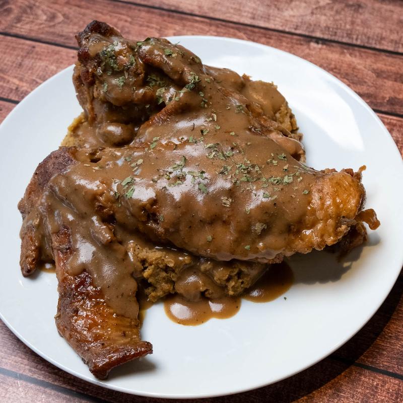 Founded with dressing and your choice of two sides. Also comes with two cornbread muffins.