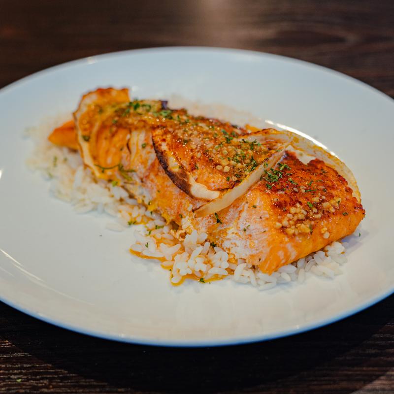 Baked Salmon with Rosemary Glaze, and white rice. Chose any two side option. Also comes with two cornbread muffins.
